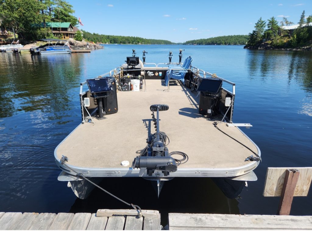 Two Solix Humminbird 15″ Screens. One 16″ Garmin Live Scope Panoptics Fishfinder. Minn Kota Ulterra Trolling Motor, that moves the Tritoon around 10 mph. 360 Humminbird Imaging attached to the trolling moter. 2 JBL bluetooth speakers to listen to your favorite songs. (If you like) Over $30,000.00 dollars in electronics on this boat definitely helps us locate big walleye throughout the year! Being a Tritoon The Barilko is a very sturdy and steady boat in all weather conditions, walking around is no problem at all.